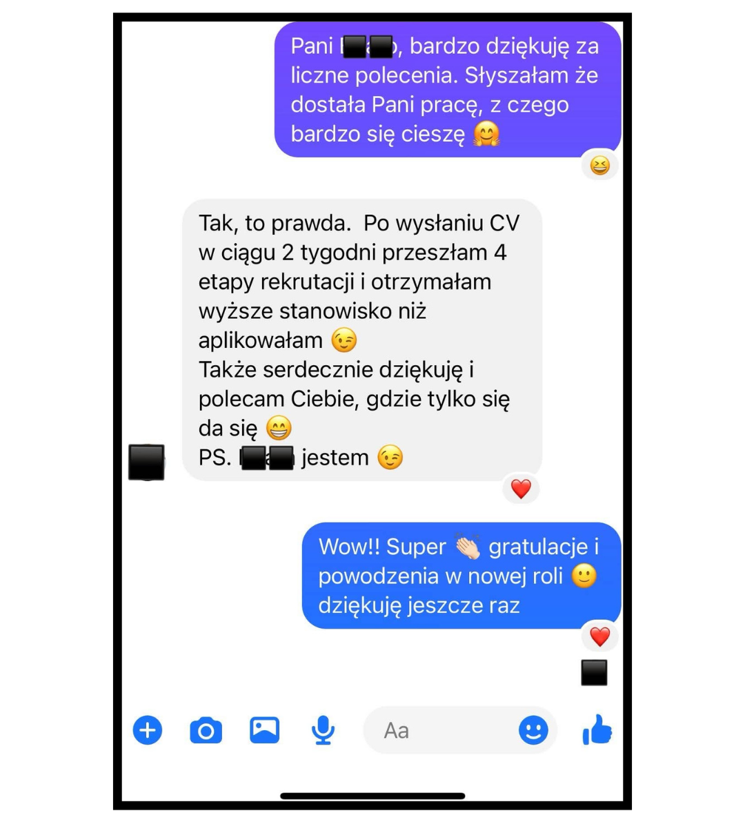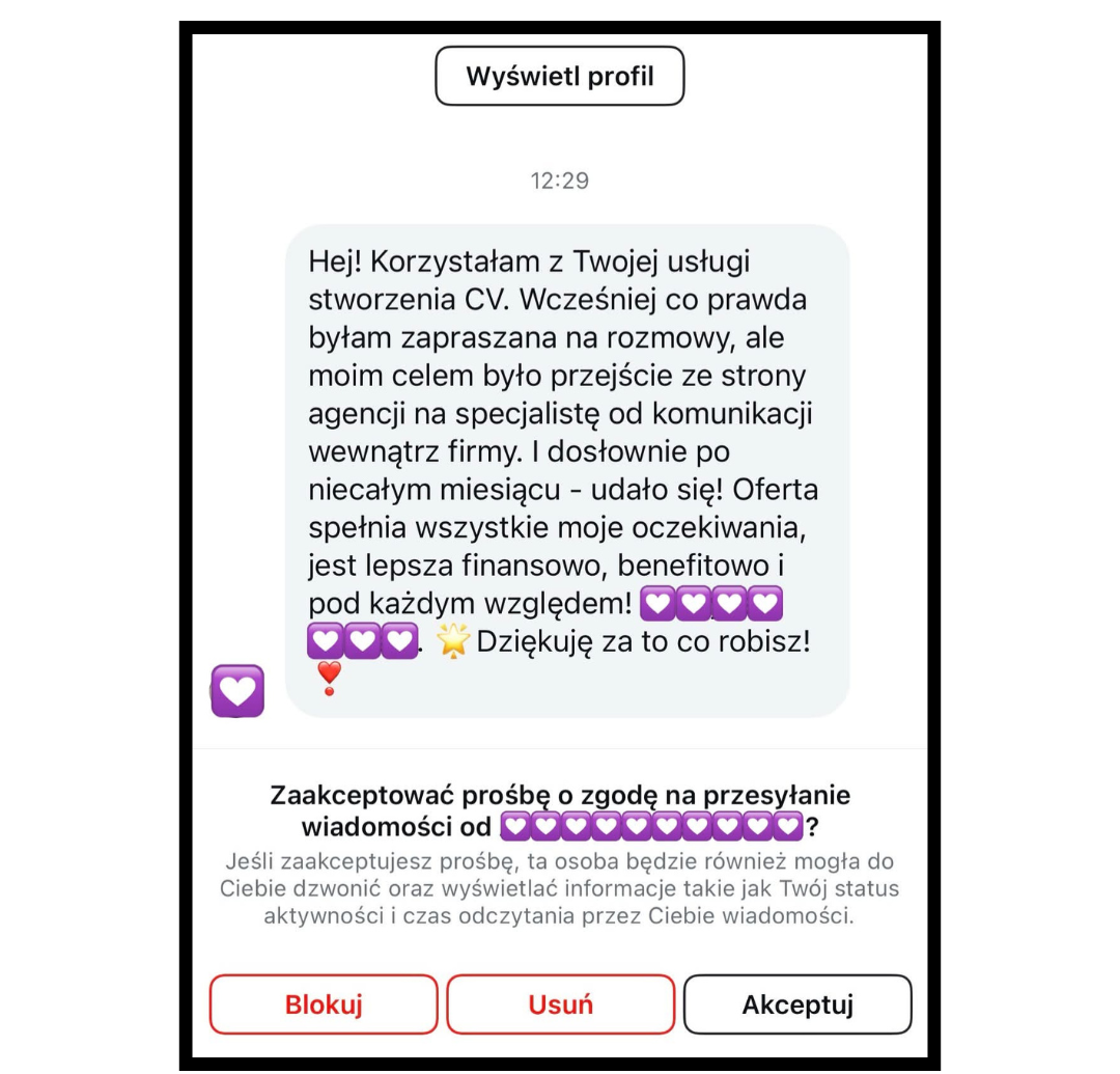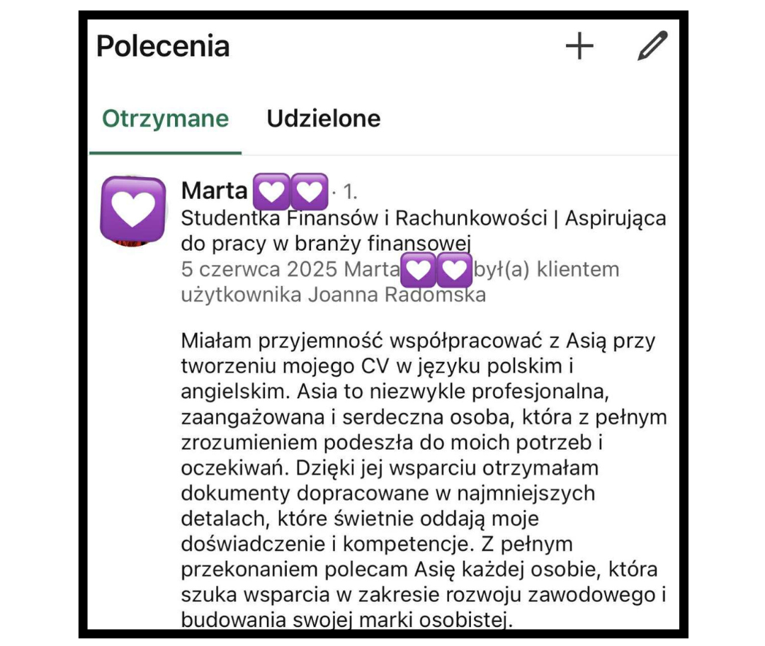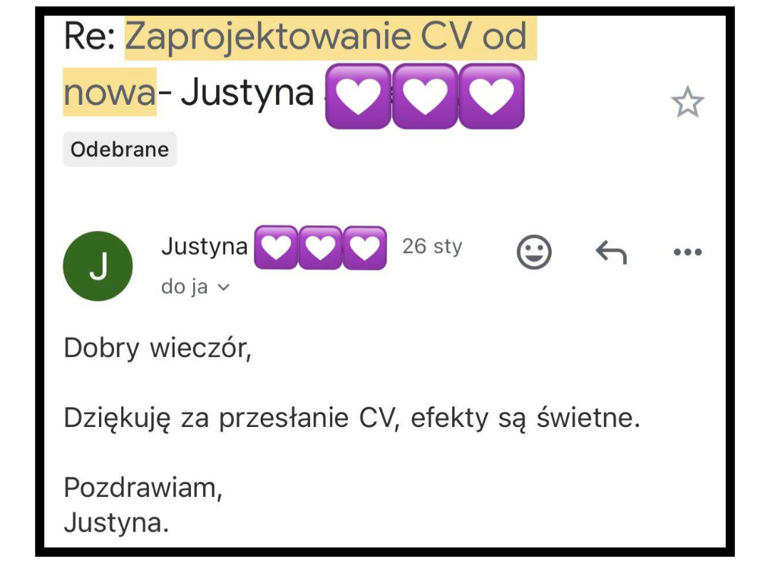 Jako doświadczona rekruterka pomogłam już wielu osobom, które wcześniej nie były zapraszane na rozmowy rekrutacyjne. Dzięki mojej pomocy i zaprojektowaniu CV w końcu to się udało!